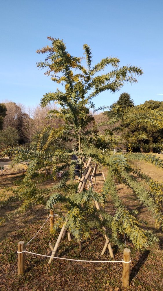 来園者たちの念願叶って1年前に再植樹したミモザ。黄色いポンポンの花が咲き始めました!