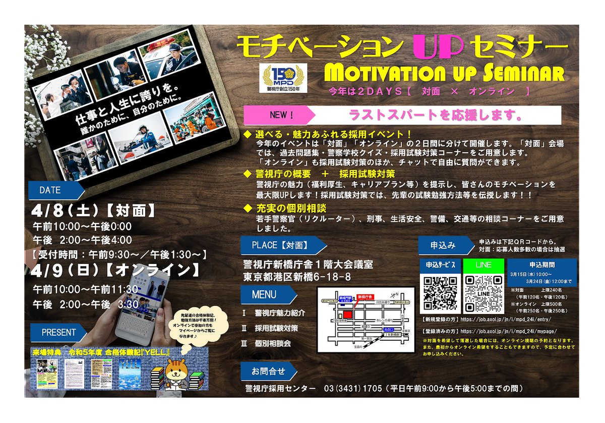 【イベント情報】 4月8日(土)、9日(日)開催予定の「モチベーションアップセミナー」の申込みはお済みですか? 現役職員の話を対面で聞くことができる貴重な機会ですので、ぜひご参加ください!