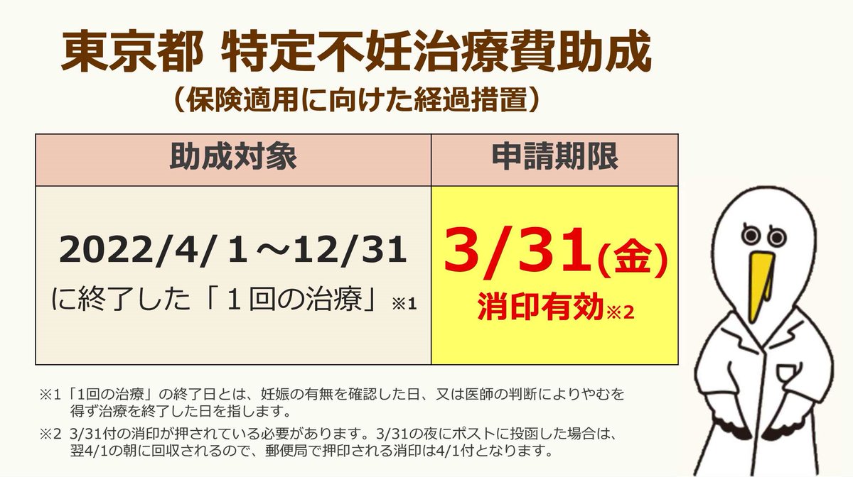 【#不妊治療助成金】令和4年3月31日以前に開始した#特定不妊治療(体外受精・顕微授精)費の一部を1回限り助成します。今月末は令和4年12月までに終了した治療の申請期限です(消印有効・期限厳守)。治療..