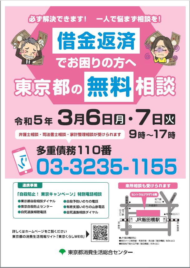 \特別相談「多重債務110番」を実施!/ 3月6日(月)・7日(火)は、弁護士等の専門家が#無料 で、#債務整理 をお手伝いします。 お電話(03-3235-1155) または 来所(地下鉄飯田橋駅直結ビル)ください。