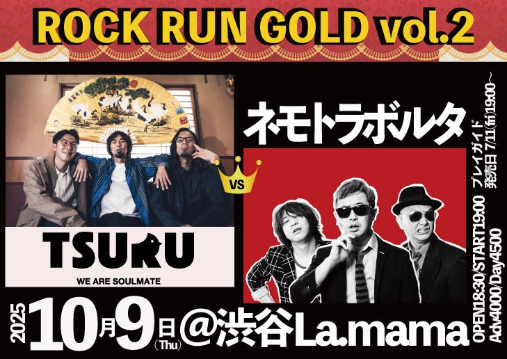 【チケット発売中】10/9(THU)ROCKRUNGOLDvol.2ネモトラボルタ/鶴OPEN/START18:30/19:00ADV¥4,000+Dチケットの購入はこちらから!https://epl..