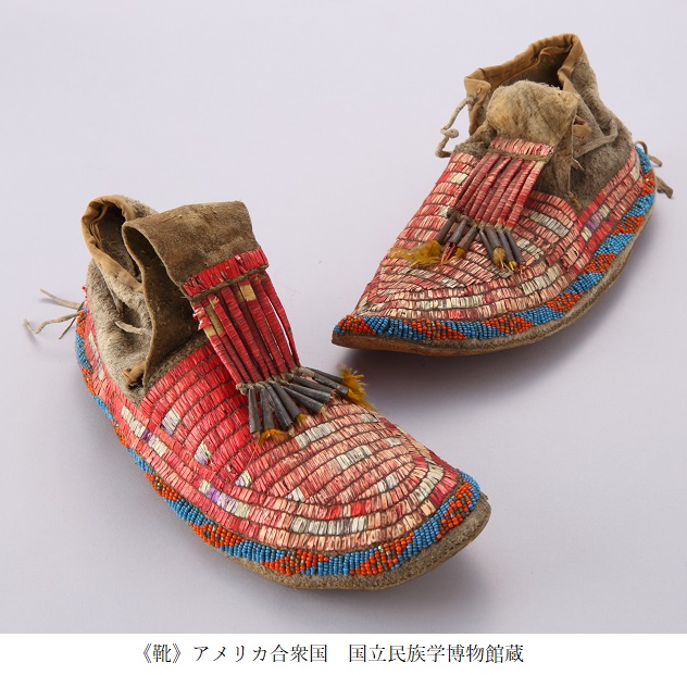 【ビーズ展オススメ作品:北アメリカ編】この靴の甲とベロの赤い部分は何の素材でできていると思いますか?これは、ヤマアラシのトゲを赤く染めてビーズにしたものなのです。細いトゲを綺麗に縫い付けることで、美し..