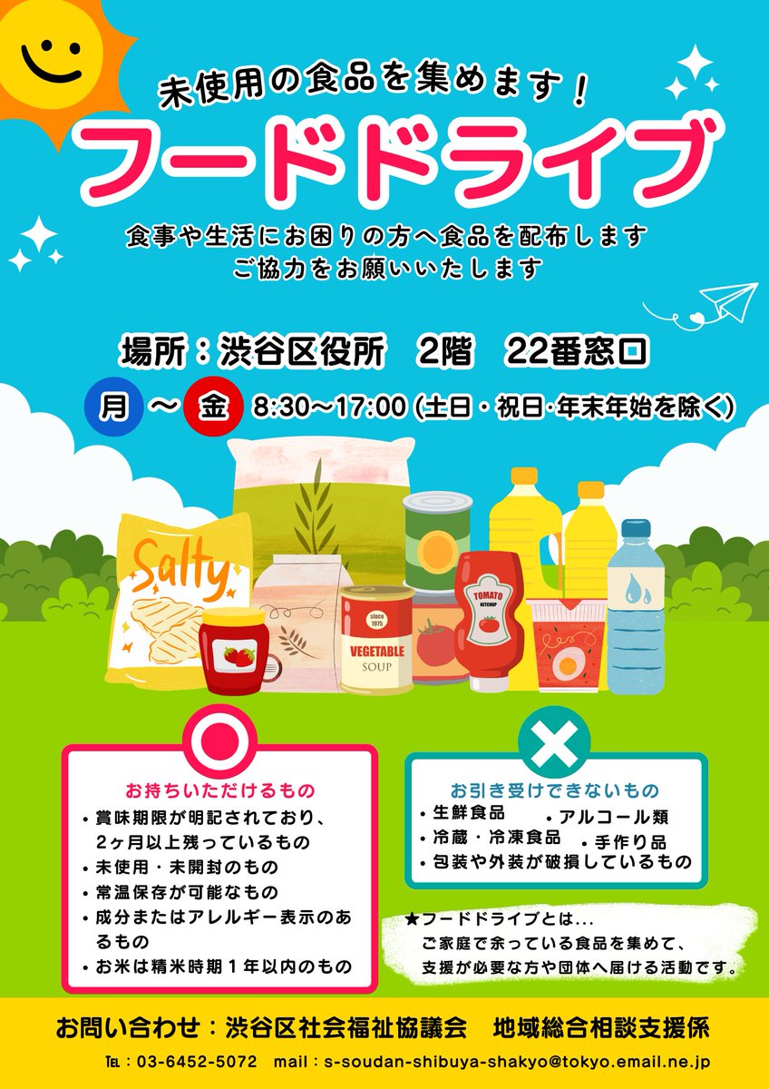 新たに渋谷区社会福祉協議会で、ご家庭に余っている食品を集める「フードドライブ」をスタートします!受け付けるのは、賞味期限が2か月以上/未使用、未開封/常温保存が可能/成分またはアレルギー表示がある/お..