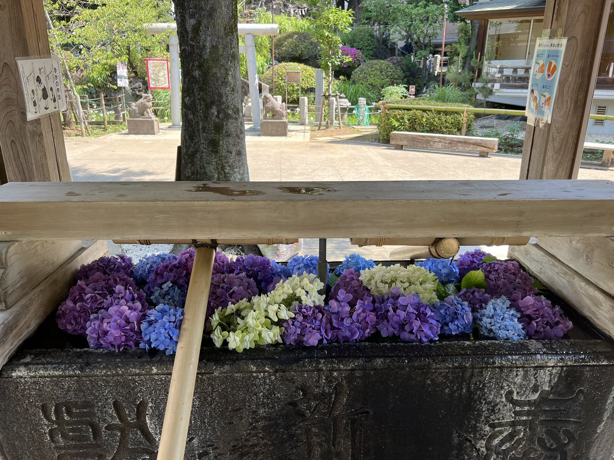 今週も紫陽花の花手水です💐今回は紫・青とカシワバアジサイの白が入っています(^^)期間限定なのでお早めにお越し下さい♪#鳩森八幡神社#鳩森神社#鳩の森八幡神社#鳩の森神社#花手水#花手水がある神社#紫..