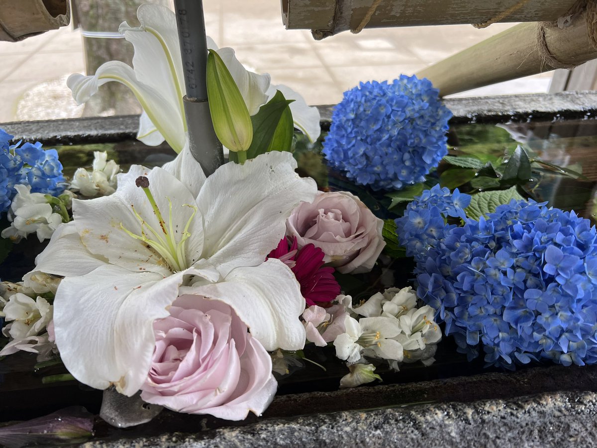 今だけ花手水に紫陽花入れてます(^^) #鳩森八幡神社 #鳩森神社 #鳩の森八幡神社 #花手水 #紫陽花