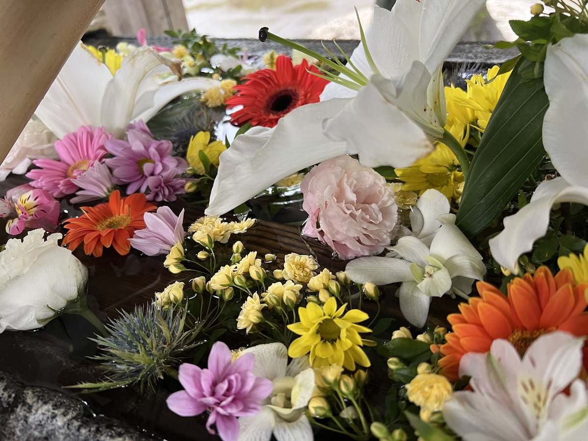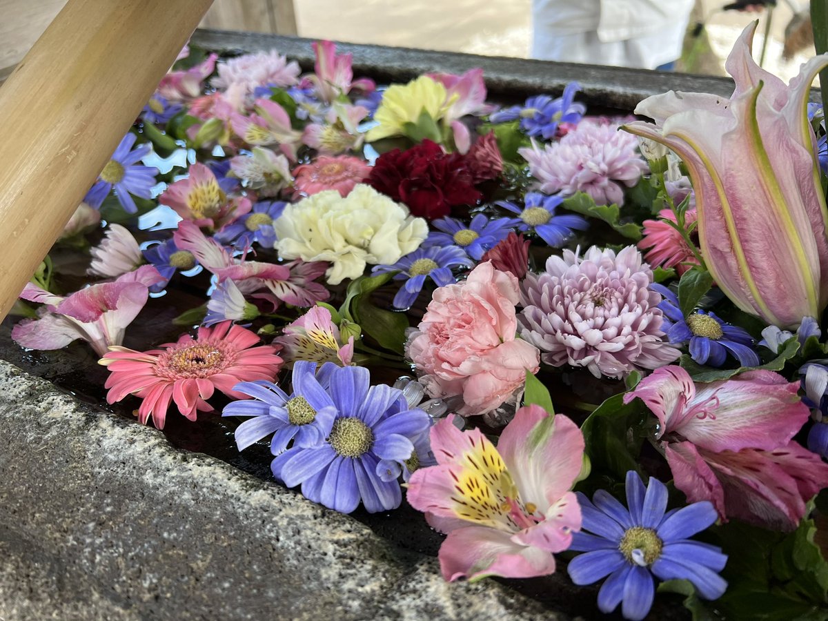 今日は甲賀稲荷社の例祭です!昨年に続き雨です。。。さて、今週の花手水です🌸モッコウバラ・デンファレ・トルコキキョウ・ユリ・ガーベラ・カーネーション・スプレーマム・アルストロメリア・エレンジュームです(..