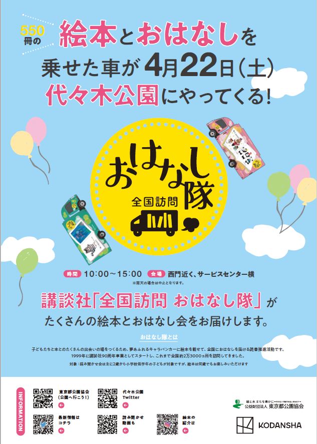 ついに今週末の土曜日です🚙🚙♪ 代々木公園では初めての読み聞かせイベント開催です! #代々木公園 #よよこう #読み聞かせ #講談社 #キャラバンカー #おはなし隊 #4月22日