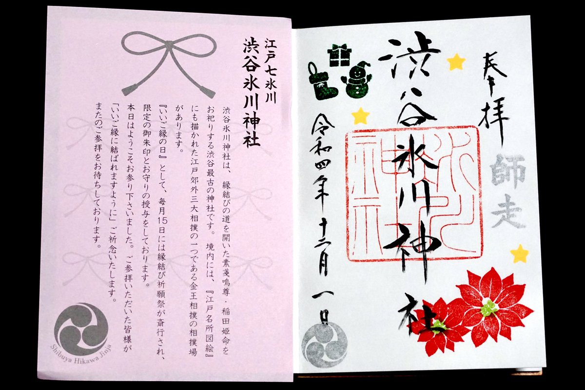 渋谷氷川神社。渋谷区東。12月中に授与の「月替わり御朱印」を頂きました。帳面への書き入れ再開しています。15日は縁結び御朱印、25日-31日は大祓特別御朱印を授与。11月23日より授与の細工御朱印・新..