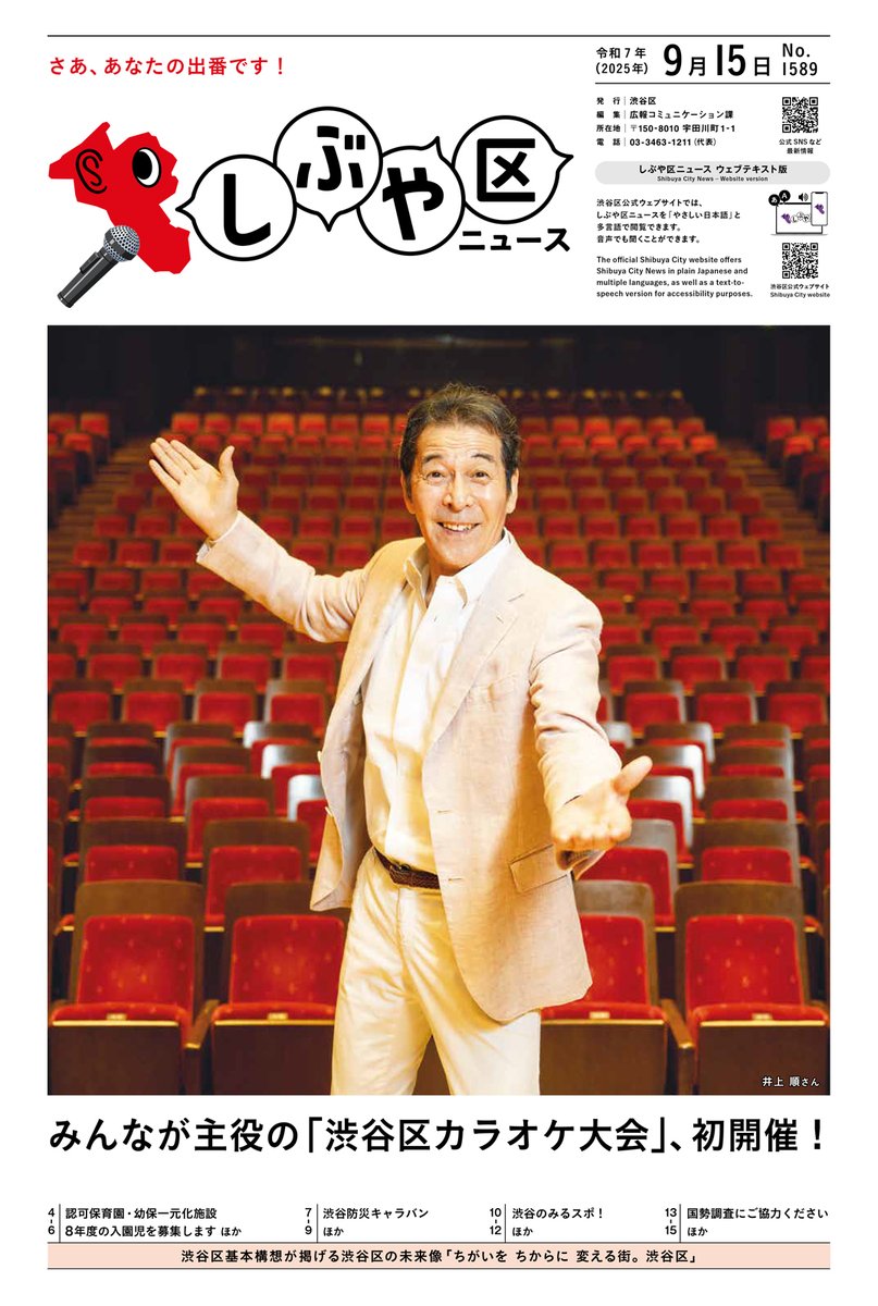 【お知らせ】しぶや区ニュース9月15日号を発行しました。特集は「みんなが主役の『渋谷区カラオケ大会』、初開催!」内容は「渋谷のみるスポ!」などです。(広報コミュニケーション課)https://city..