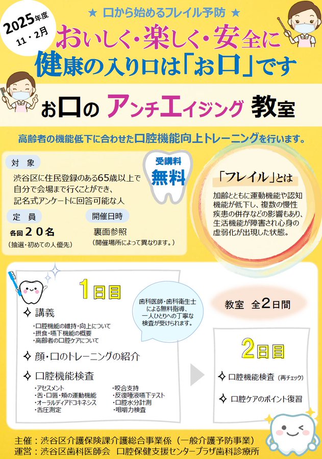 【お知らせ】「お口のアンチエイジング教室(全2回)」を開催します。対象:区に住民登録のある65歳以上で自分で会場まで行くことができ、記名式アンケートに回答可能な人申込:~10/10(金)詳しくは、区ポ..