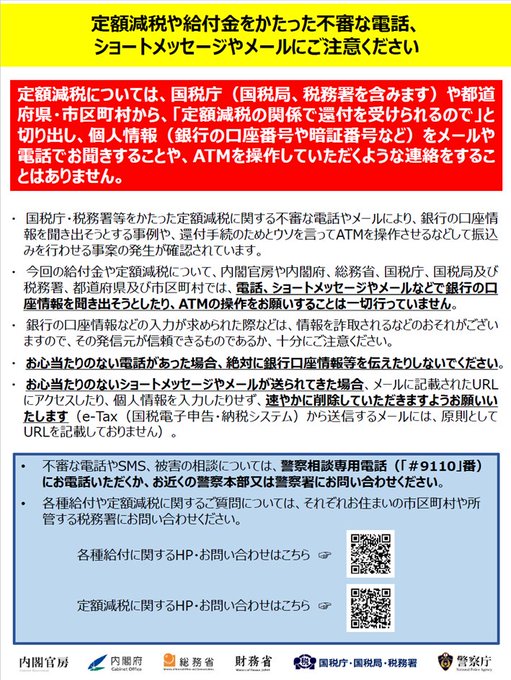 【注意喚起】渋谷区職員を名乗り「定額減税の関係で還付を受けられる」などと言って、個人情報をメールや電話で聞き出したり、ATMに誘導したりする被害が発生しています。少しでも不審に思うことがあった場合は、..