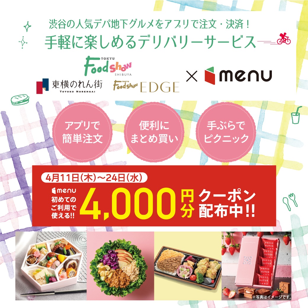 /4,000円分クーポン配布中🎁!\渋谷の人気デパ地下グルメを〈menu〉で注文・決済!手軽に楽しめるデリバリーサービスのご案内🚲💨お弁当🍱パン🥐スイーツ🍩など#渋谷東急フードショーのグルメをお届け♪..