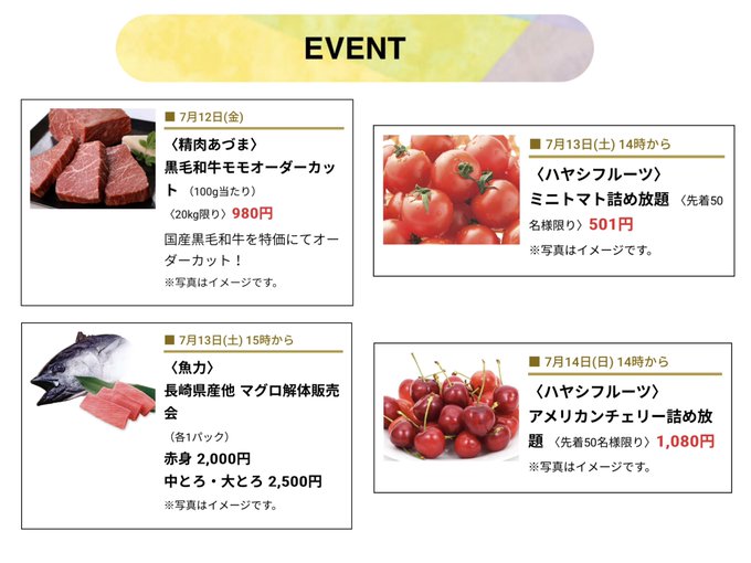 \予告/#フードショースペシャルウィークお楽しみいろいろEVENT盛りだくさん国産黒毛和牛のオーダーカットや、まぐろの解体販売会トマトとチェリーの詰め放題も開催ですご来店お待ちしております!詳しくはコ..