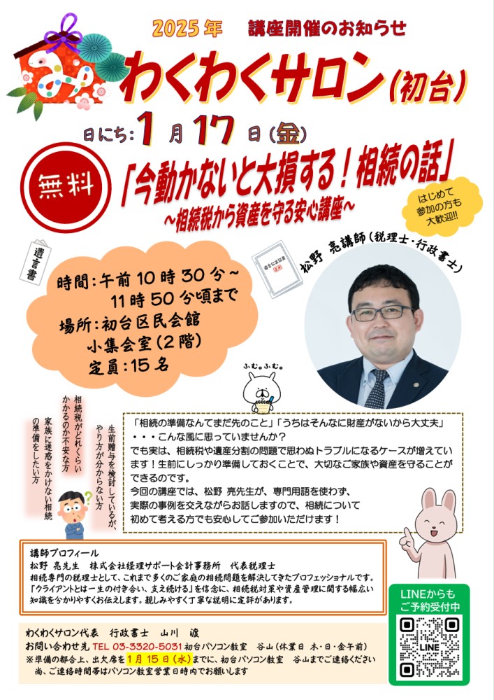 松野講師(税理士・行政書士)を招いて、専門用語を使わず、実際の事例を交えながらお話しますので、相続について初めて考える方でも安心してご参加いただけます!