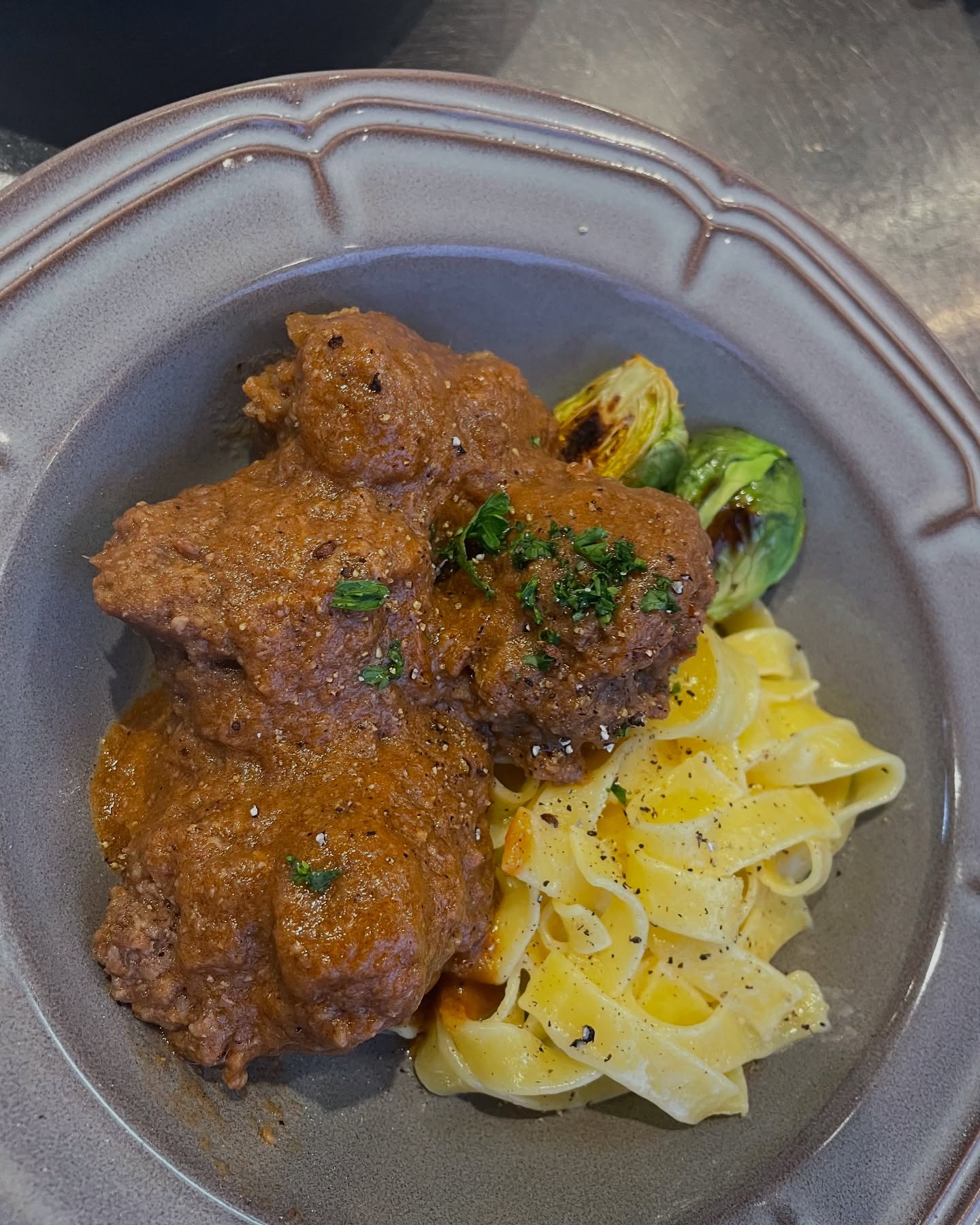 .【椎名牛ブーレット ヌイユ添え】ランチメニューです!フランス料理のミートボールです😊玉ねぎたっぷりのソースに付け合わせのヌイユ(卵麺)を絡めてお召し上がりください♪結構ボリューム感あるので、満足感も..