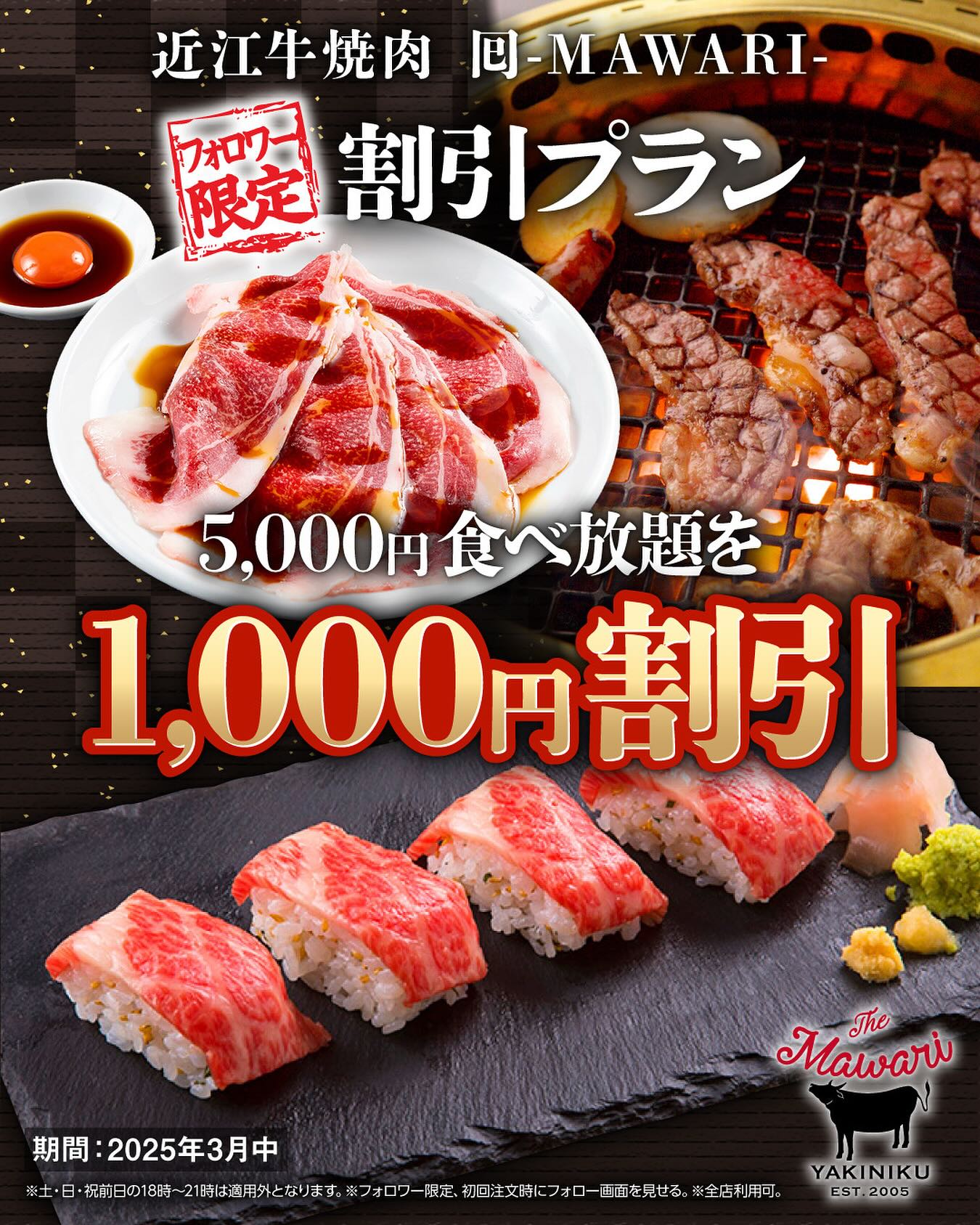 5,000円のコースを1,000円割引✨作業は2ステップのみ🎶①当アカウントをフォロー📲②注文時にフォロー画面提示💡※全店舗利用可能⚠️土・日・祝前日の18時から21時は適用外となります。(17時食べ..
