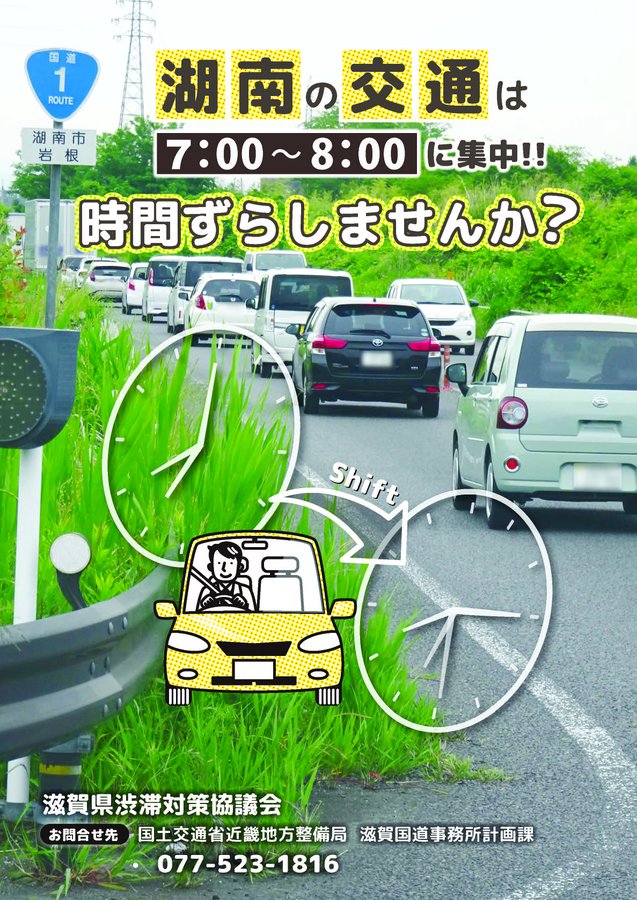 【時差出勤にご協力ください】国道1号(イオンタウン湖南周辺)では、朝7時~8時の通勤時間帯に甲賀市・三重県方面の渋滞が慢性的に発生しています。朝6時台・8時台に通勤時間をずらすことで、最大12分の移動..