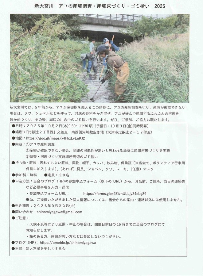 〇新大宮川を美しくする会〇新大宮川アユの産卵調査・産卵床づくり・ゴミ拾いアユが産卵期を迎えるこの時期にアユの産卵調査を行い、産卵が確認できない場合は、アユが好んで産卵する河床をつくり、その後、周辺の川..