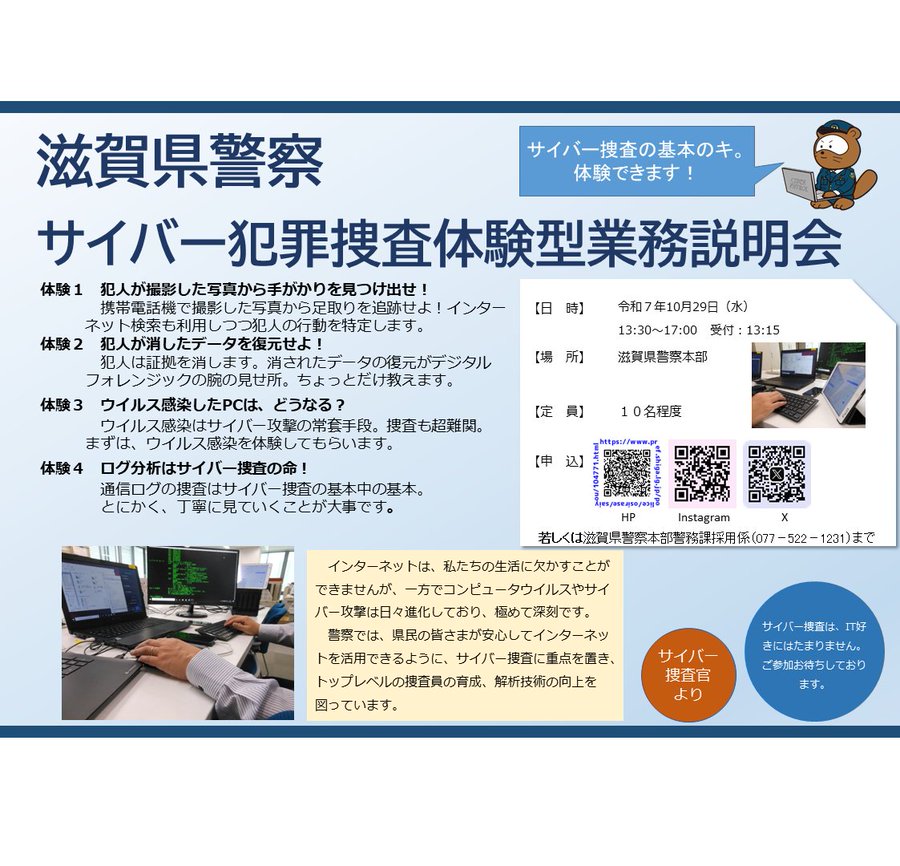 【サイバー犯罪捜査体験型業務説明会の開催】開催日時:令和7年10月29日(水)午後1時30分から午後5時開催場所:滋賀県警察本部対象者:10人程度内容:〇サイバー犯罪捜査体験〇サイバー犯罪捜査官とのフ..