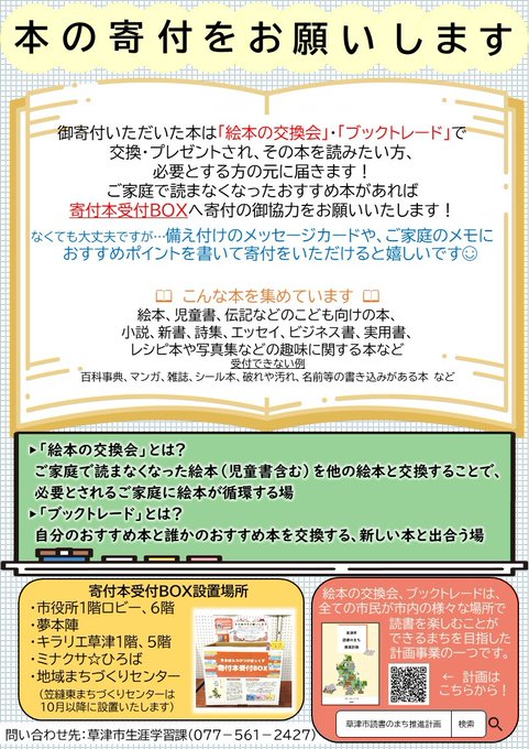 /本の寄付にご協力お願いします\寄付いただいた本は「絵本の交換会」や「ブックトレード」で、その本を読みたい方や必要とする方の元へ届きますご家庭で読まなくなった本があれば、ぜひ寄付本受付BOXへ寄付のご..