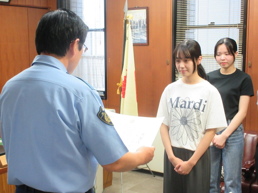 ☆高齢女性を保護してくれた学生さんに感謝状を贈呈しました☆【長浜警察署】9月9日(月)、道路に座り込んでいた高齢の女性を、安全な場所まで避難させて無事に保護してくれた学生さんに署長感謝状を贈呈したよ!..