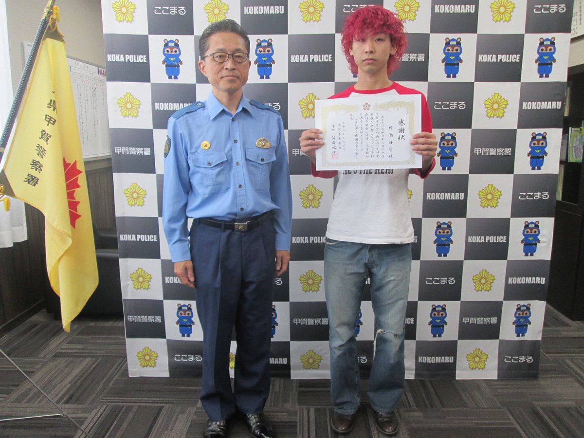 ☆人命救助に貢献してくれた男性に感謝状を贈呈しました☆【甲賀警察署】9月5日(木)、人命救助に貢献された功労で、野瀬海聖さんに署長感謝状を贈呈したよ。野瀬さんは、悪天候の深夜に甲賀市内を車で走行中、傘..