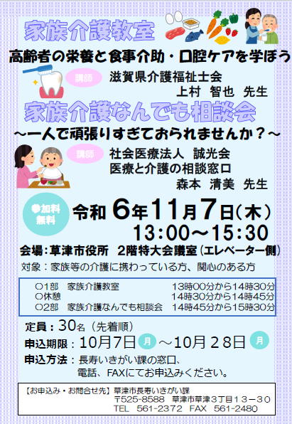 家族介護教室&家族介護なんでも相談会の開催介護に関する知識の取得や悩み等を相談・共有することで負担を軽減しませんか。とき11/7㈭13:00∼15:30ところ草津市役所2階特大会議室※定員30名(先着..