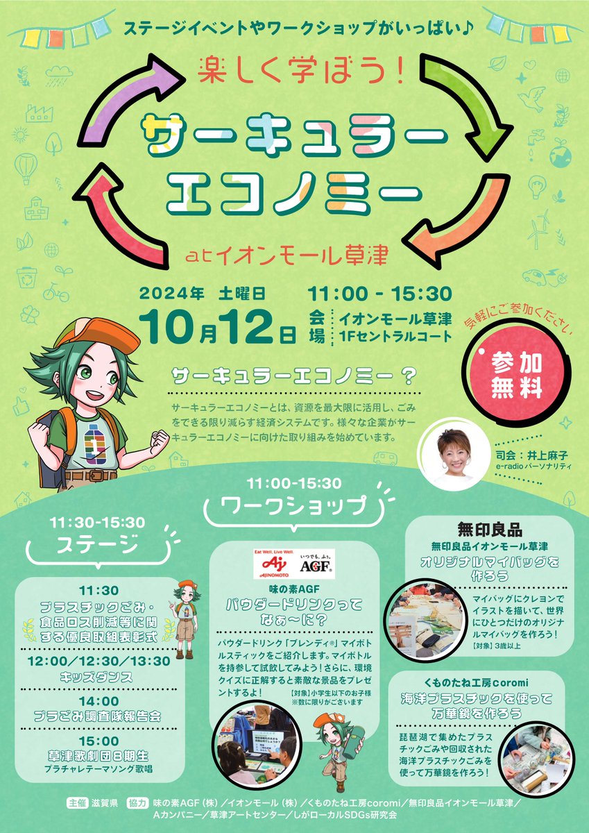 『「楽しく学ぼうサーキュラーエコノミー」atイオンモール草津』を開催するwoワークショップやステージイベントもあるwo!無料で参加できるから遊びにきてね(*^▽^*)日時:10月12日(土)11:00..