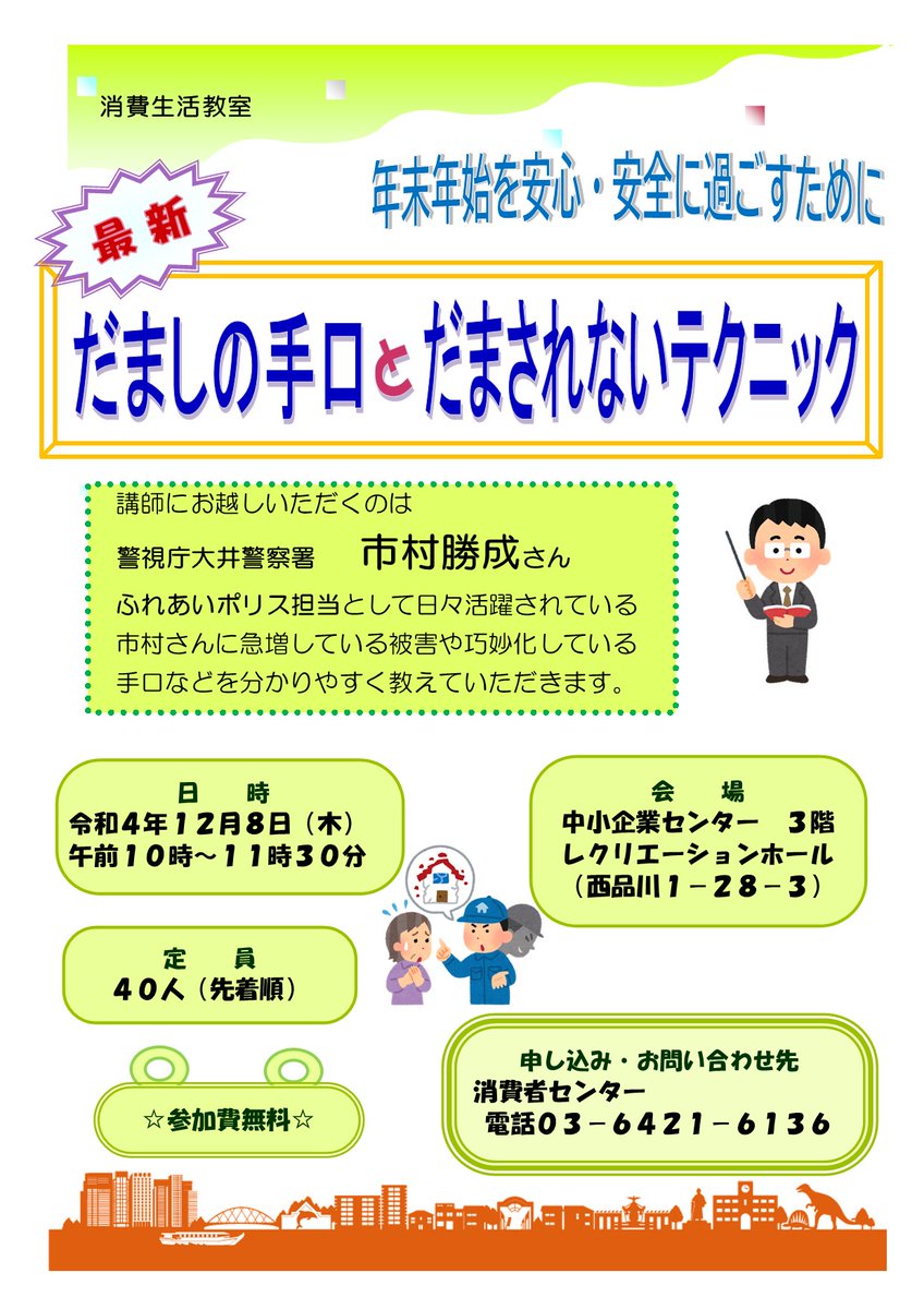 お申込み・お問合せは、電話で品川区消費者センターへ(03-6421-6136)