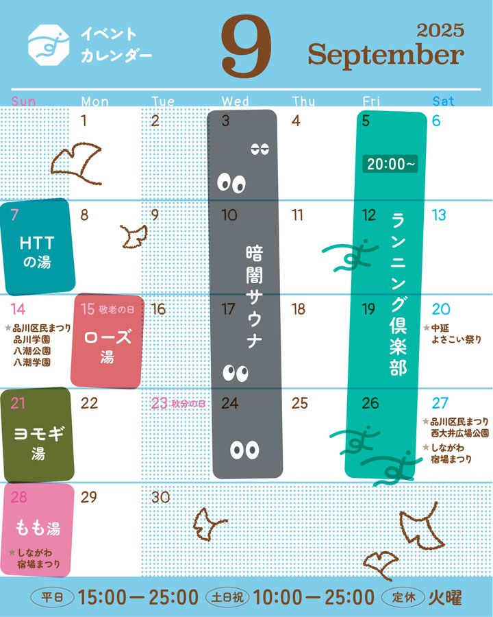 9月のカレンダーができましたすえひろ湯のイベントは予定がありませんが、品川区ではたくさんのお祭りが開催されるようです!お祭りの後はぜひ#す活に来てくださいね〜!23日(秋分の日)は定休日なのでお休みで..