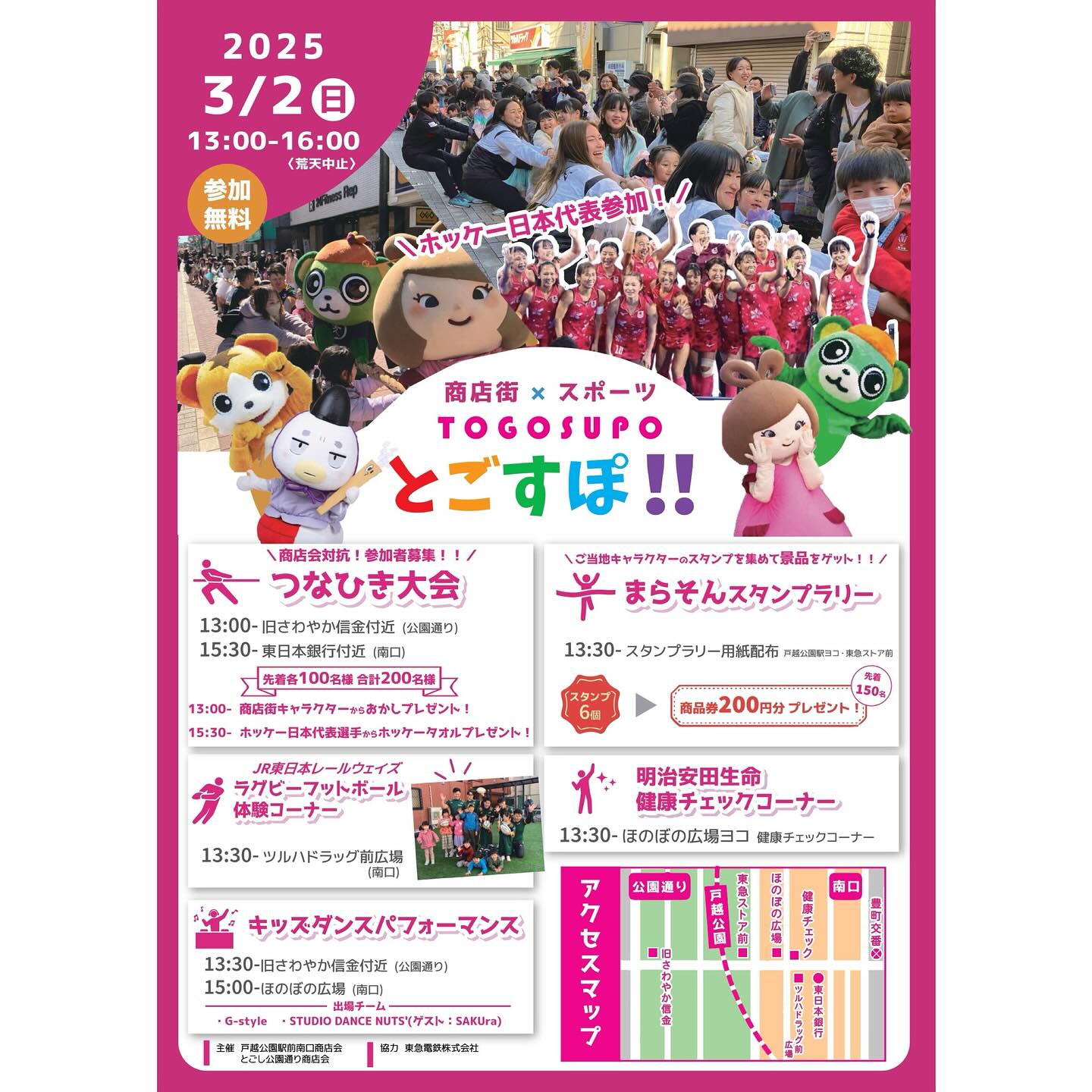 3月2日(日)は「とごすぽ‼︎」開催!商店街とスポーツがコラボして、商店街でさまざまなスポーツを体験できます。▪️綱引き大会商店街の直前道路を使って綱引き合戦!ホッケー日本代表、ご当地キャラクターも参..