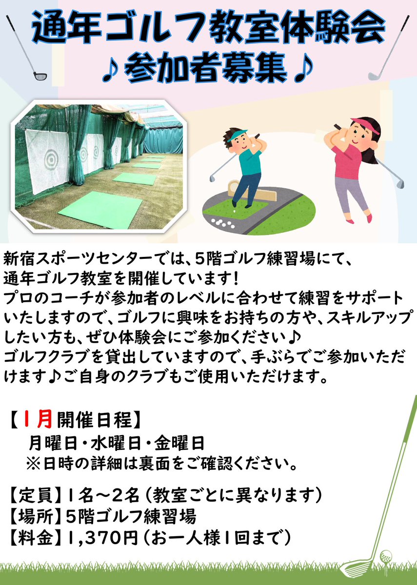皆様こんばんは🌒新宿スポーツセンターです。1月後半に行われる通年ゴルフ教室体験会のお知らせを致します!⛳️当施設5Fゴルフ練習場にて、月曜日、水曜日、金曜日に開催致します。日時は添付の画像をご確認下さ..