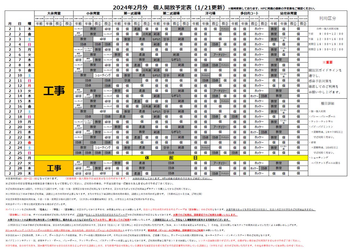2月個人開放予定表です。 ご確認をお願いいたします。 1月~3月まで、 大体育室は工事となり、お休みになります。 ご理解いただきますようお願いいたします。 ※予定は変更になる可能性があります。 最新の予定表をご確認いただきお越しください。