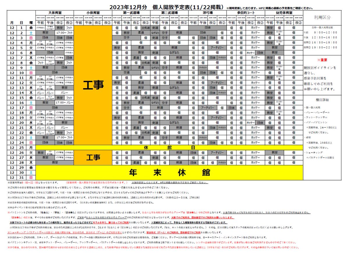 12月個人開放予定表です。ご確認をお願いいたします。12月の1か月間は、小体育室が工事となりお休みになります。それに伴い、大体育室も一部スケジュールが、定例とは変更となっております。※予定は変更になる..