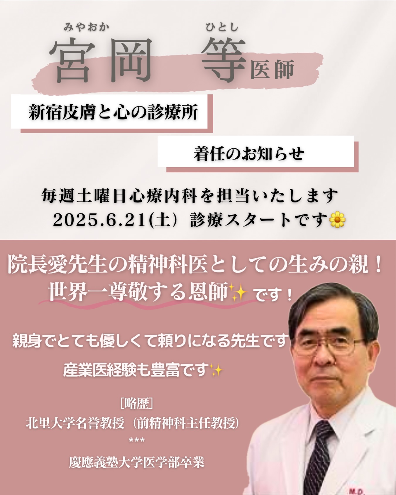 🕊️💌いつもご覧いただきありがとうございます!新宿皮膚と心の診療所です!2025年6月21日(土)より宮岡等(みやおかひとし)医師が着任いたします。心療内科のプロフェッショナルで患者様にも優しく頼りに..