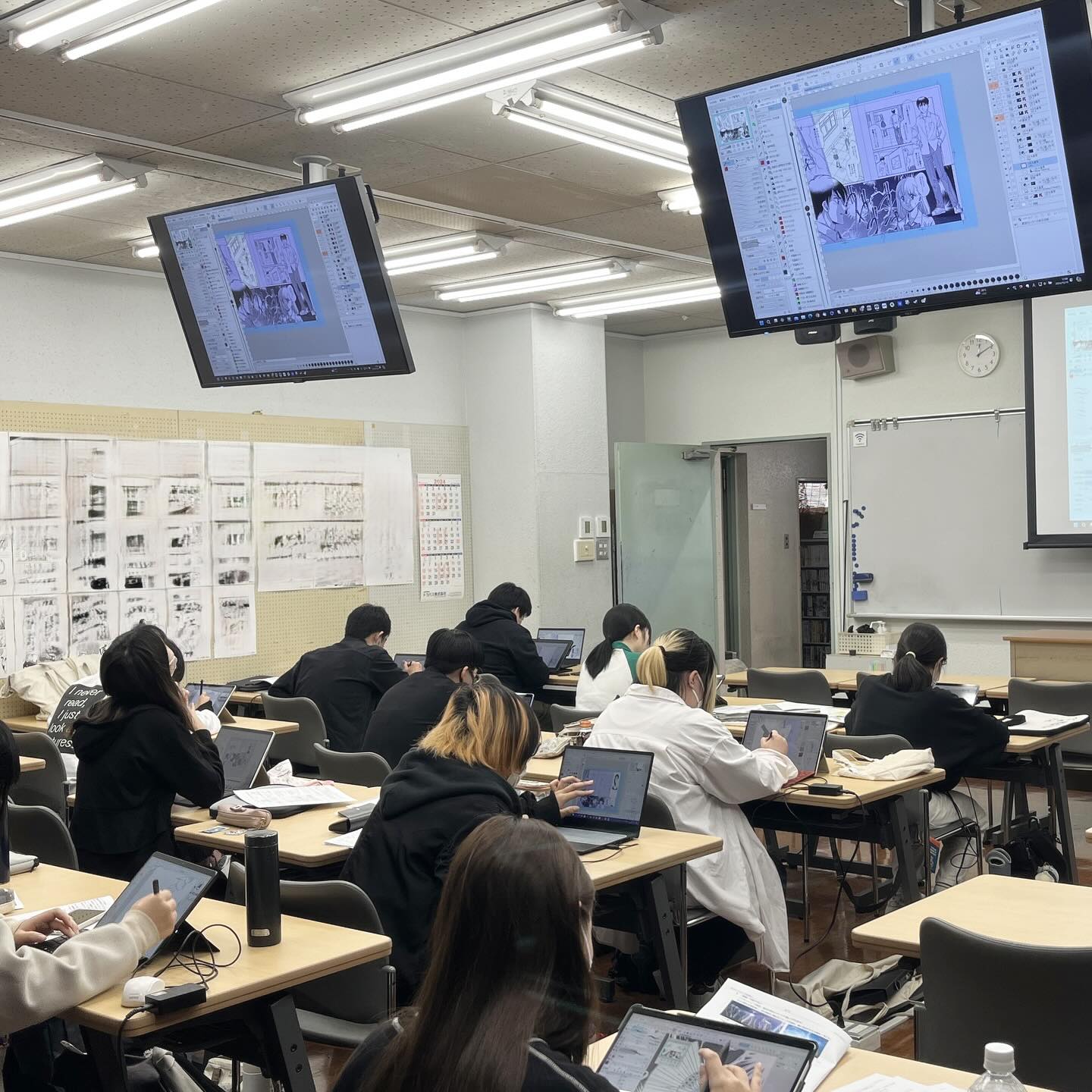 【授業紹介】マンガ科1年生の「デジタル原稿基礎」の授業。後期に入ると、見開きの漫画2ページ分を描いて..