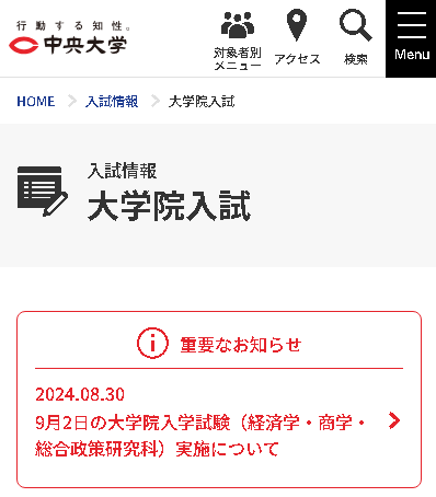 #中央大学大学院入試より9月2日の大学院入学試験(経済学・商学・総合政策研究科)実施についてhttps://chuo-u.ac.jp/admission/gschool/topics/2024/08/..