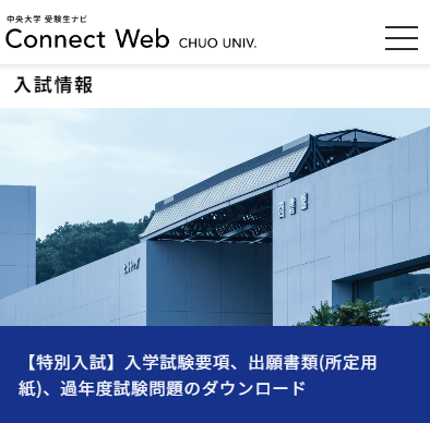 #中央大学受験生ナビConnectWeb入試情報より【特別入試】入学試験要項、出願書類(所定用紙)、過年度試験問題のダウンロードhttps://chuo-u.ac.jp/connect/admissi..