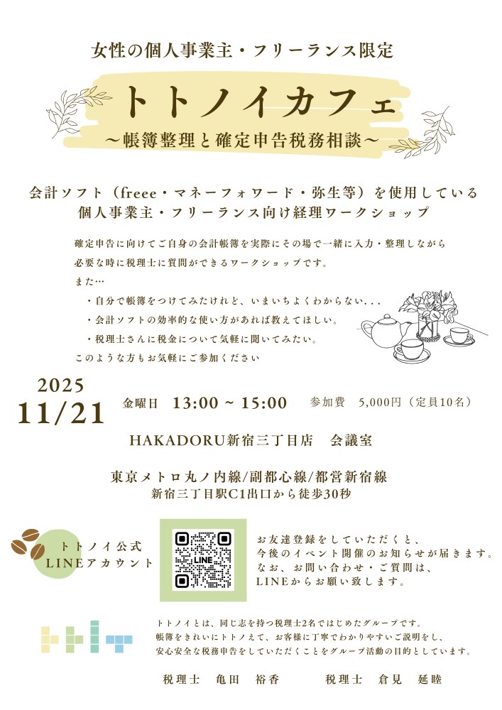 ✨11/21(金)確定申告相談(女性の個人事業主・フリーランスの方限定)✨