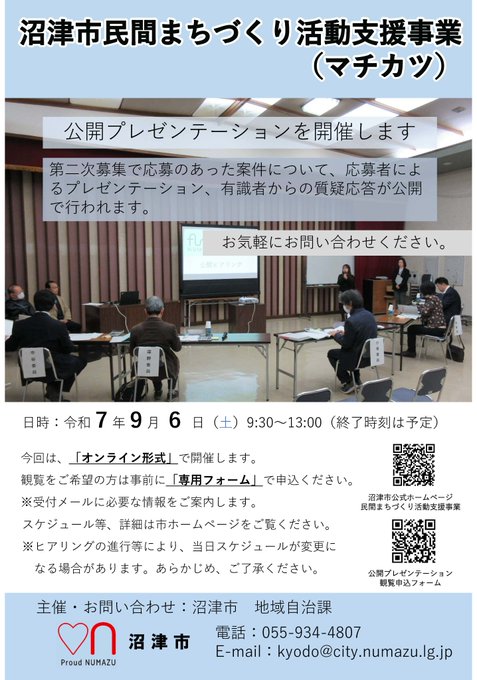 【マチカツ公開プレゼンテーション】9月6日(土)、まちづくり活動に応募いただいた事業の公開プレゼンテーション審査をオンライン形式で実施します!観覧をご希望の方は、事前に専用フォームで申し込みください。..