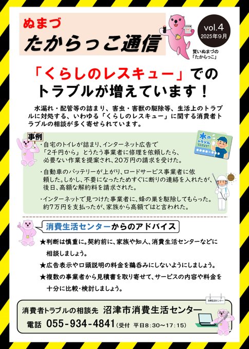 【「くらしのレスキュー」でのトラブルが増えています!】水漏れ工事や害虫駆除など「くらしのレスキュー」でのトラブルが増えています。契約する前に、家族など周りの人に相談し、よく検討しましょう。詳しくはこち..