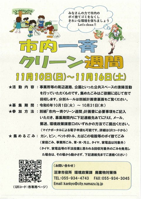 【市内一斉クリーン週間に参加する市内事業所・団体の皆さまを募集】毎年11月の第2日曜日から1週間は市内一斉クリーン週間です身近な生活環境に関心を向けるきっかけに、環境経営における取り組みのひとつに、こ..