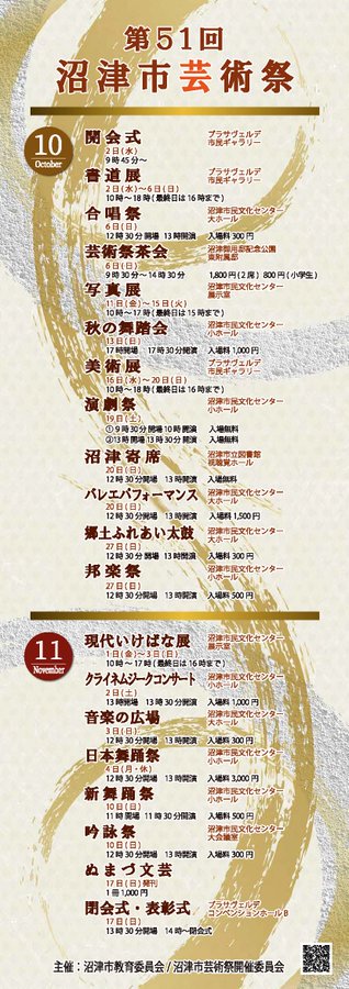 【市民芸術の祭典沼津市芸術祭が始まります!】今年の芸術祭は、10月2日から11月17日までの期間中、展示やステージなど多彩なジャンルの発表が行われます。ぜひ会場で沼津の誇る文化芸術をお楽しみください!..