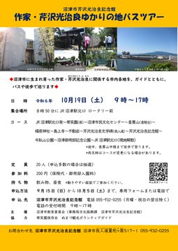 【#沼津市#芹沢光治良記念館作家・#芹沢光治良ゆかりの地バスツアーのお知らせ】日時:10月19日(土)9~17時定員:20人(申込多数時抽選)申込:10月5日(土)まで専用フォームor電話(055-9..