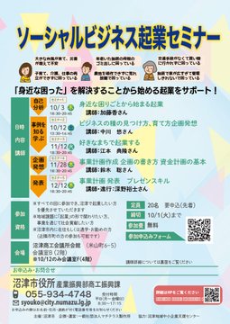 【ソーシャルビジネス起業セミナー】沼津市内において、地域課題に取り組み、暮らしやすいまちづくりを目指して起業する方を対象に、ソーシャルビジネス起業セミナーを開催します。詳細はこちらhttps://ci..