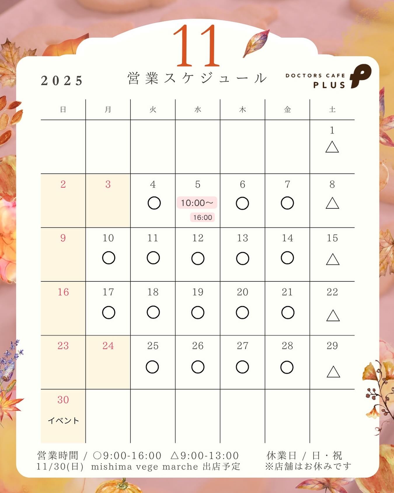 ・~11月営業日カレンダー🍁〜いつも当店をご利用いただきありがとうございます🌿11/5(水)はスタッフ研修のため開店時間を10:00とさせていただきます。11/30(日)はイベント出店予定です✨️※..