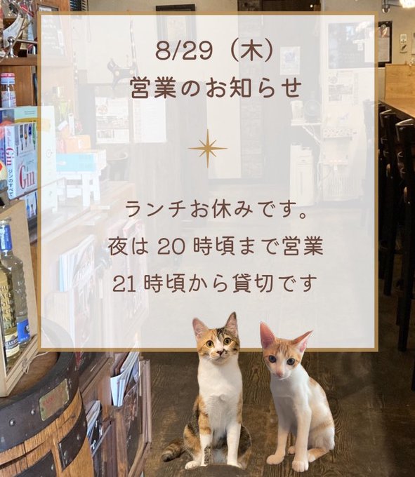 8月29日(木) ランチお休みです 夜は20時頃まで通常営業しますが、21時頃から貸切になります