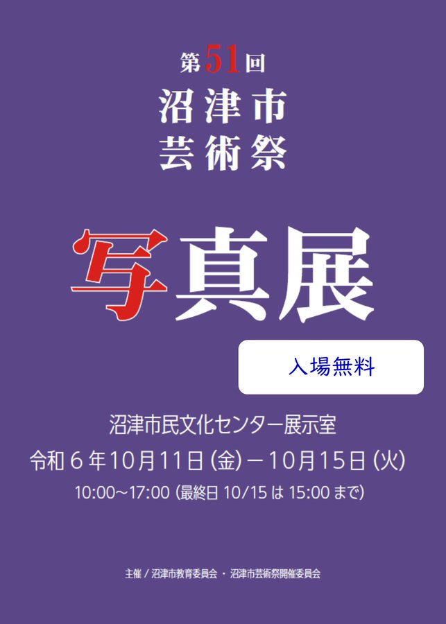 市民芸術の祭典、芸術祭「写真展」スタート!今年は、来場者が作品を鑑賞し投票する形式によって、各賞を決定します。ぜひ会場にお越しください!期間:10/11(金)~10/15(火)10:00~17:00(..