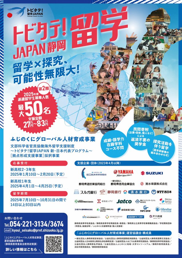 #ふじのくにグローバル人材支援事業の募集要項を公開しました留学×探究、可能性無限大あなたも海外での探究に挑戦してみませんか?#トビタテ留学japan#トビタテ10期#留学https://pref.sh..