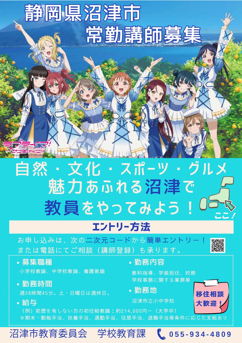 令和7年度常勤講師募集中!ラブライブ!サンシャイン!!の舞台、沼津市で教員として働きませんか?アニメの魅力あふれるこの街で、子どもたちと未来を共に育むやりがいある仕事です!詳しくは沼津市教育委員会学校..